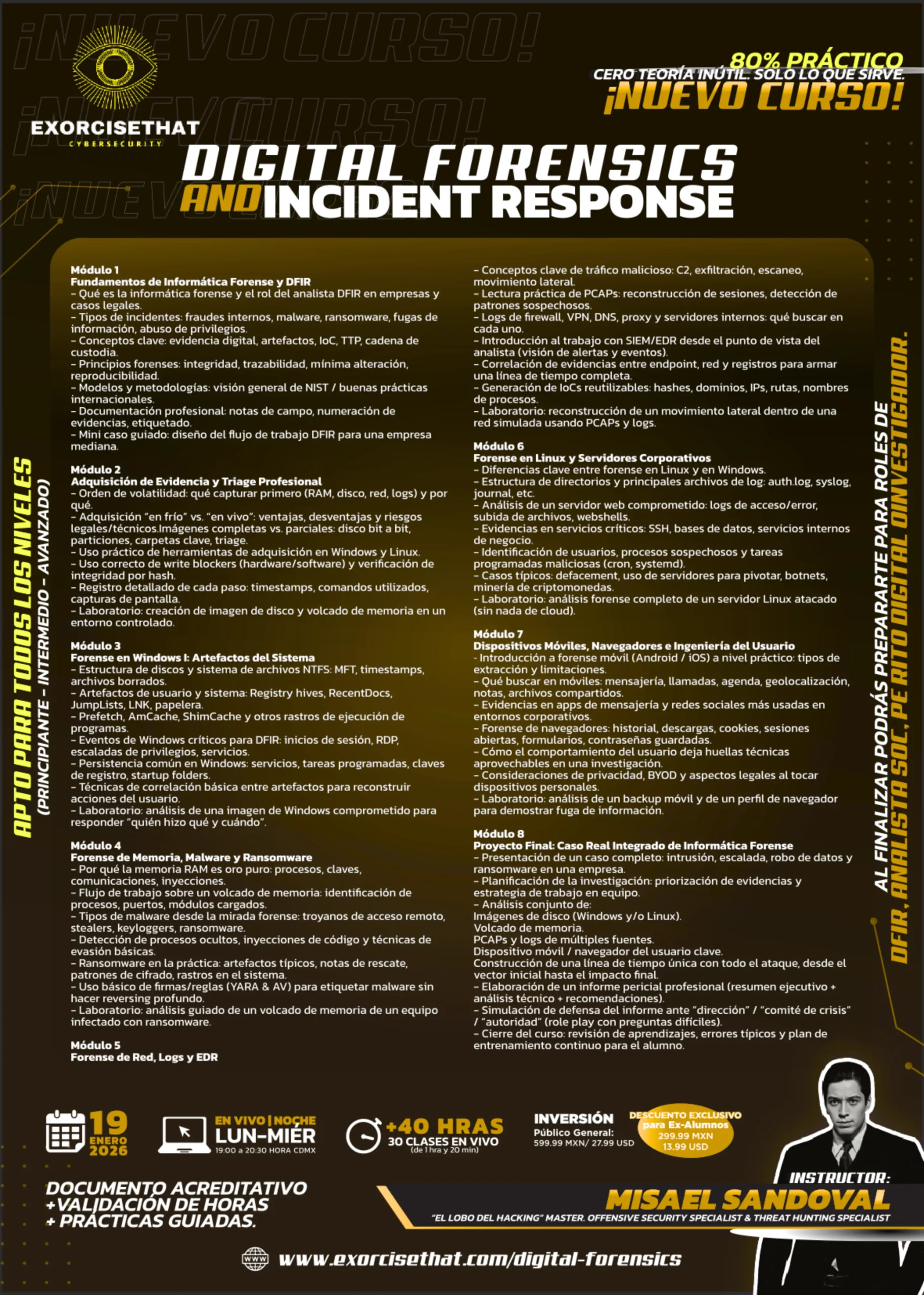 Informática Forense y Respuesta a Incidentes (DFIR Profesional) es un curso intensivo, 100% práctico, diseñado para formar analistas capaces de investigar, contener y documentar incidentes de seguridad reales en entornos corporativos.